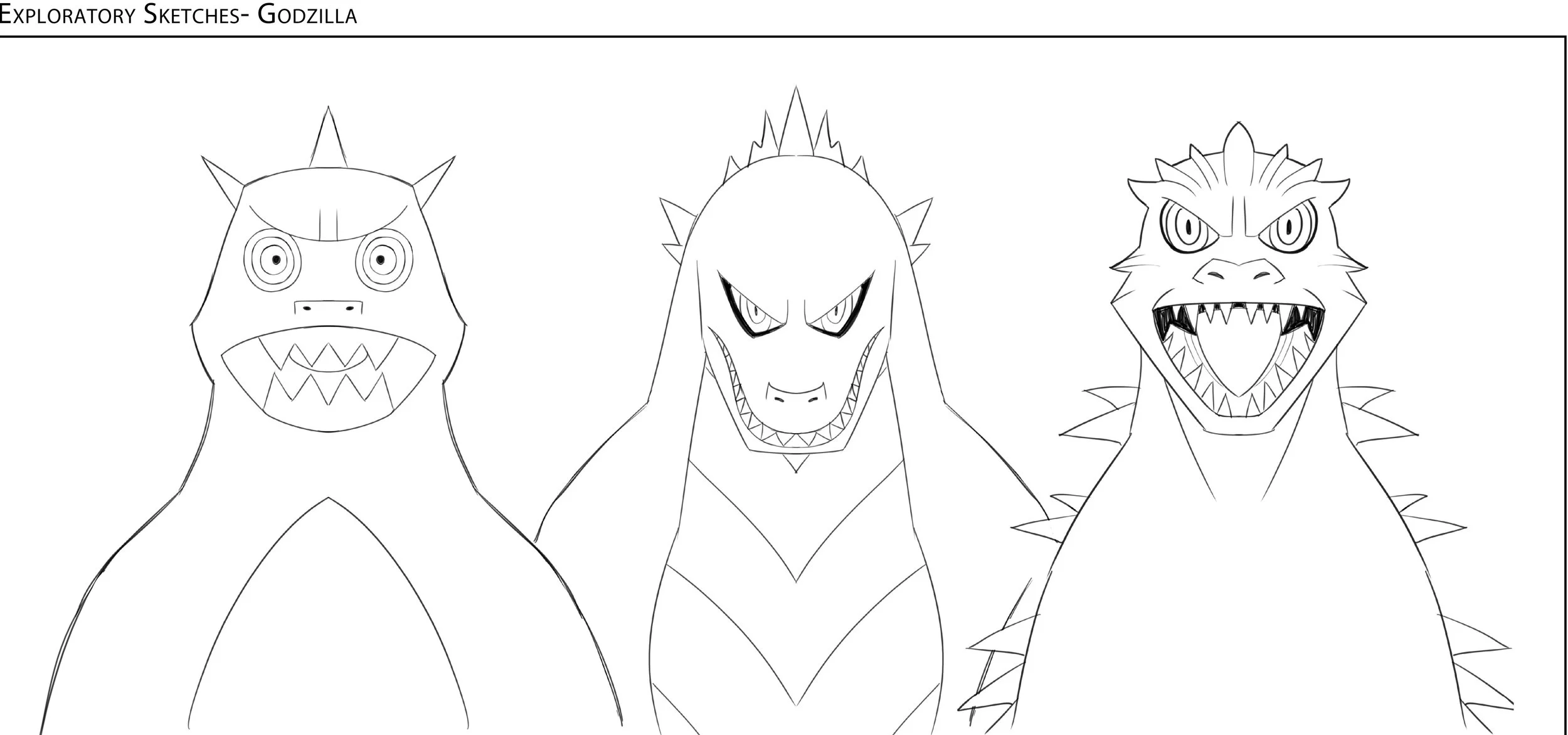 Sketch 1: This version features round eyes, a wide mouth with sharp teeth, and small spikes on the head, giving Godzilla a more approachable yet fierce look.